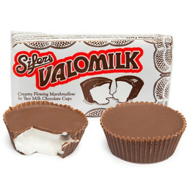 Valomilks are a marshmallow cream filled milk chocolate cup candy that was invented in 1931 by Russell Sifers Candies. They are still manufactured by the company in Merriam, Kansas. The candy features a marshmallow cream filling that is over-saturated with vanilla. If you are curious about the taste, check out this review.